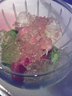 ・番茄浸出物[1]和毛豆、生火腿製成的小菜(超夏日的!!用攪拌器將番茄攪拌好後放盤子裡封好,放置一晚後就能得到純淨的番茄精華,將其凝固就可以了)