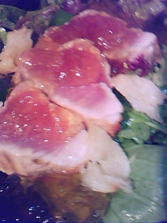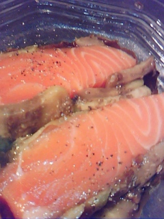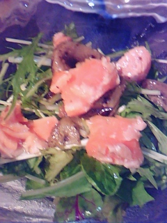 今天的照片是烤茄子壓三文魚(就是在厚切物上放點什麽)[1],後來把這個弄成小塊狀開爐加熱又做成了柚子胡椒三文魚沙拉。